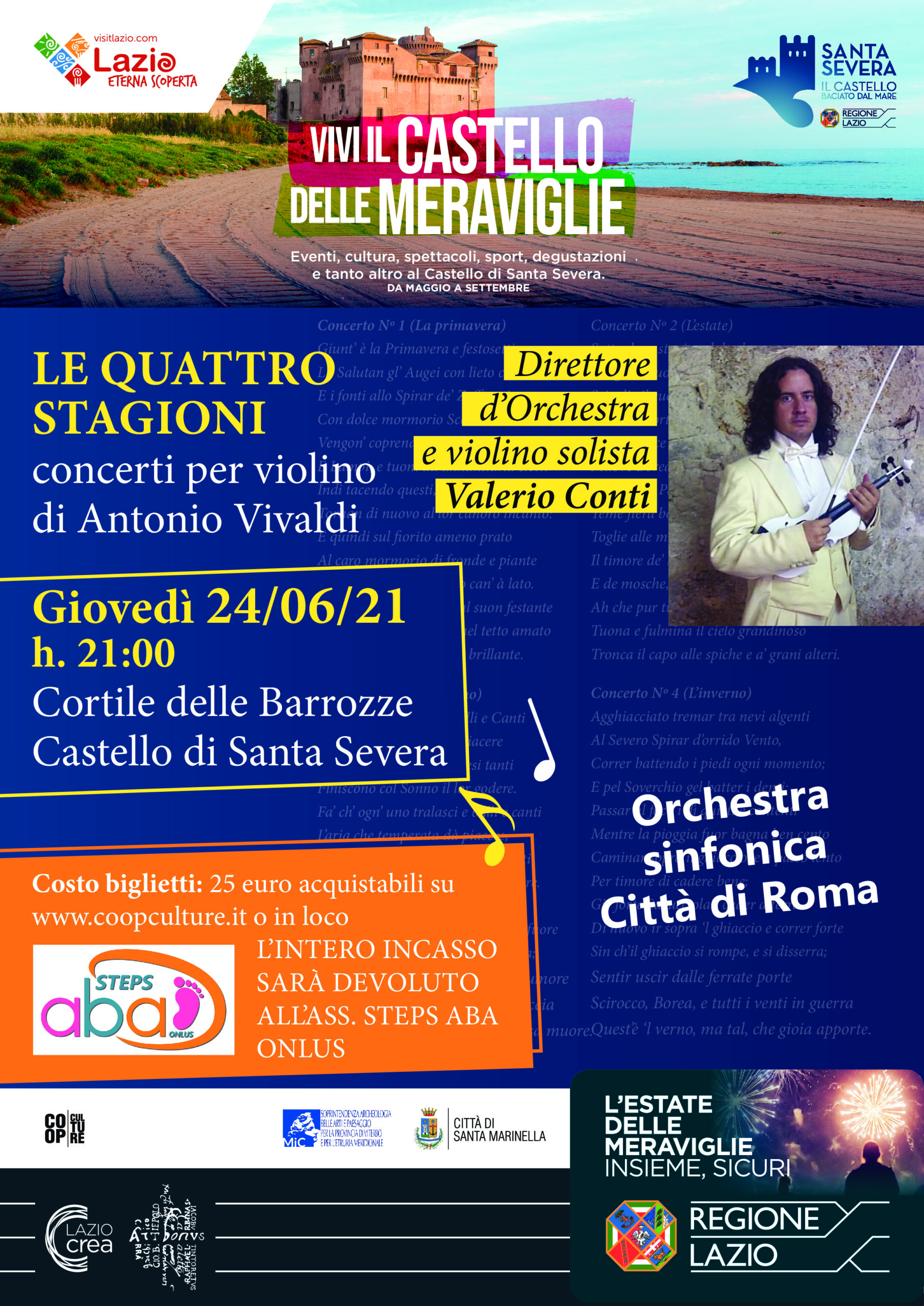 Giovedì 24 giugno alle 21.00 il gruppo da camera “ Musica Eccelsa”, in collaborazione con Orchestra Sinfonica Città di Roma, con direttore e solista Valerio Conti, eseguirà “Le Quattro Stagioni” di Antonio Vivaldi, tratte dalla raccolta di concerti Op 8 denominata Il Cimento dell’Armonia e dell’inventione.