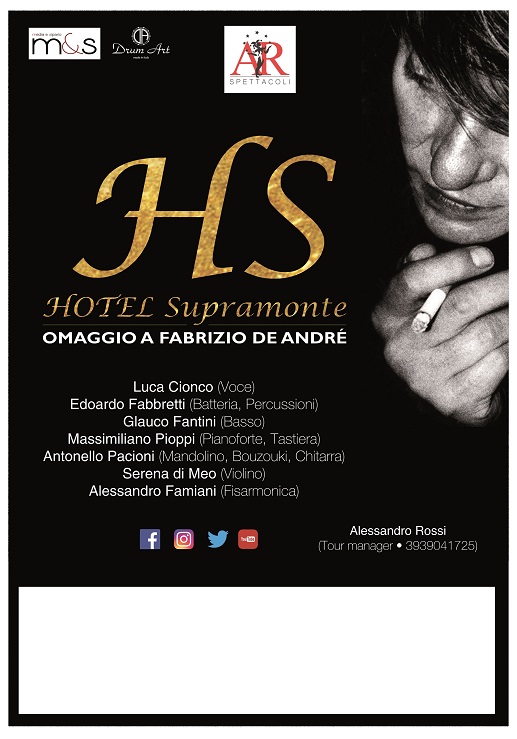Appuntamento mercoledì 22 agosto, alle ore 21.00 con gli Hotel Supramonte nella splendida cornice del castello baciato dal mare, per ricordare uno dei più grandi cantautori di tutti i tempi: Fabrizio De Andrè. L’evento, a cura di Seven Sounds, fa parte della rassegna Sere d’estate: i grandi eventi al castello di Santa Severa, organizzata dalla Regione Lazio in collaborazione con LAZIOcrea, Mibact, Comune di Santa Marinella e Coopculture.