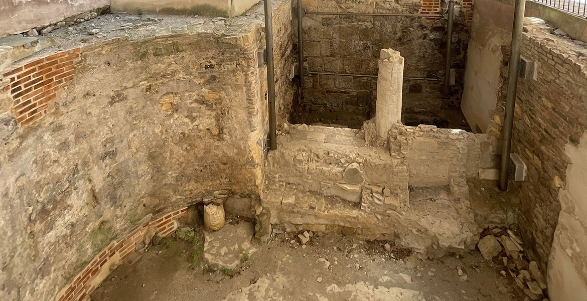 La sommità delle murature dell’abside della Chiesa si trovavano a solo dieci centimetri sotto la pavimentazione moderna del Castello. Il resto dell’edificio, invece, era largo undici metri, suddiviso in tre navate con colonne in muratura, e presentava un’abside centrale di circa tre metri e mezzo, con tracce di affreschi. La struttura era stata edificata su una villa di epoca romana, come dimostra una sezione di pavimento originale e una vasca-battistero nella navata destra, ricavata all’interno di un’area termale della villa.