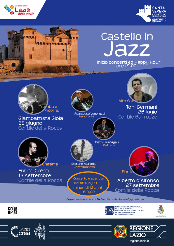 “Aperimusica” at the Castle of Santa Severa with “Castello in Jazz” concerts. The event has been organized by Stefano Marzolla, in collaboration with Regione Lazio, LAZIOcrea SpA, MiBACT, Santa Marinella Municipality, Coopculture and will take place in July, August and September.