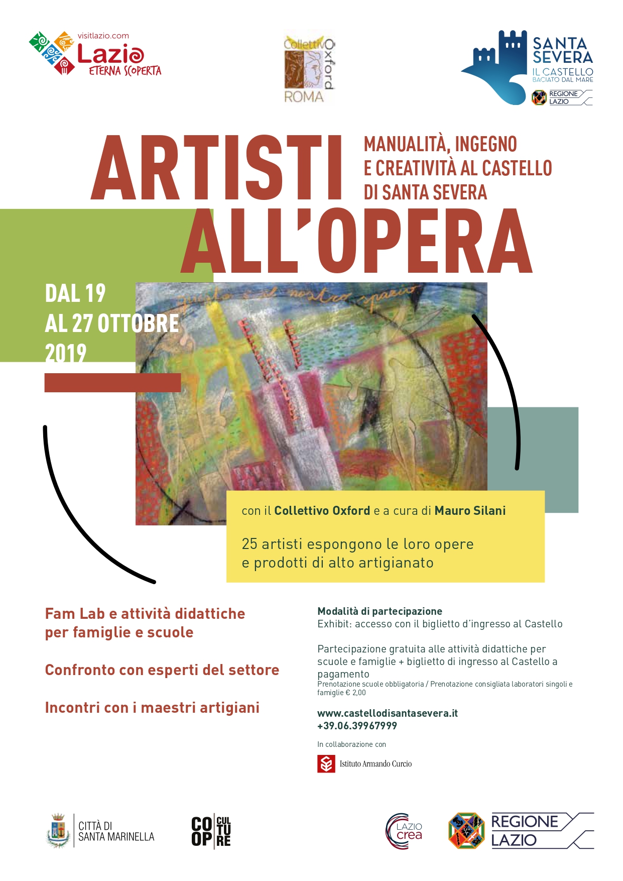 Dal 19 al 27 ottobre il Comune di Santa Marinella, in collaborazione con CoopCulture, presenta la manifestazione “Artisti all’opera. Manualità, ingegno e creatività al Castello di Santa Severa”, con Collettivo Oxford e a cura di Mauro Silani 2019 presso il Castello di Santa Severa, spazio della Regione Lazio gestito da LAZIOcrea.