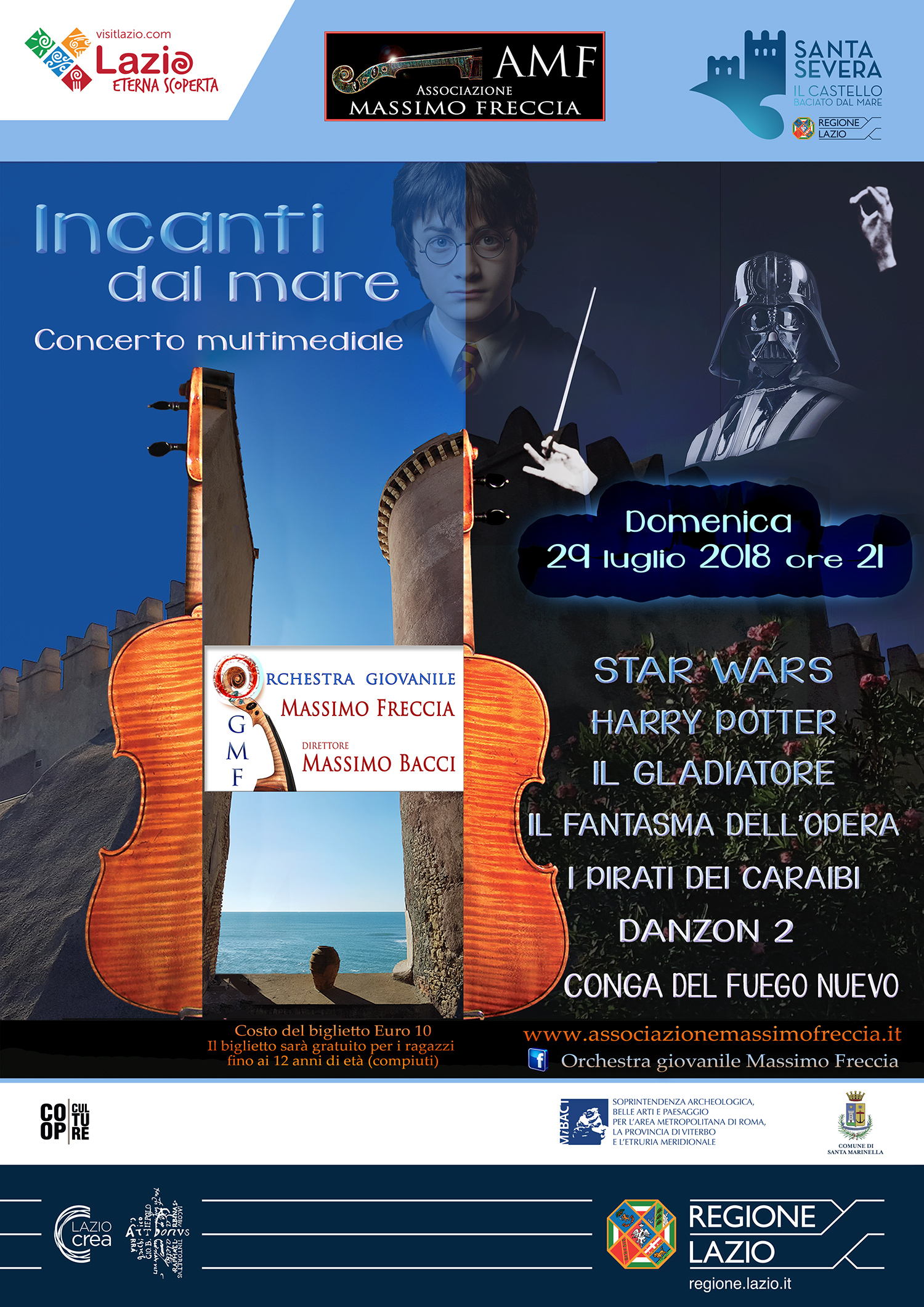 “Incanti dal Mare”, è il titolo che sintetizza perfettamente il mix per una serata indimenticabile: il mare che bacia il Castello di Santa Severa, le più fascinose colonne sonore mai scritte, da Star Wars al Gladiatore, da Harry Potter al Fantasma dell’Opera e Pirata dei Caraibi, oltre ai prorompenti Danzon e Conga del fuego nuevo di Marquez, le immagini dei film che interagiscono in tempo reale con la partitura musicale creando una suggestione unica e originale, la carica e l’entusiasmo di una grande orchestra sinfonica affermata in ambito nazionale, l’Orchestra giovanile Massimo Freccia con il direttore, Massimo Bacci, che riveste nello stesso anche tempo il ruolo di autore e regista, tra i primi a creare rappresentazioni multimediale arrivate fino a Berlino nel 2010 in rappresentanza dell’Italia e della Regione Lazio.