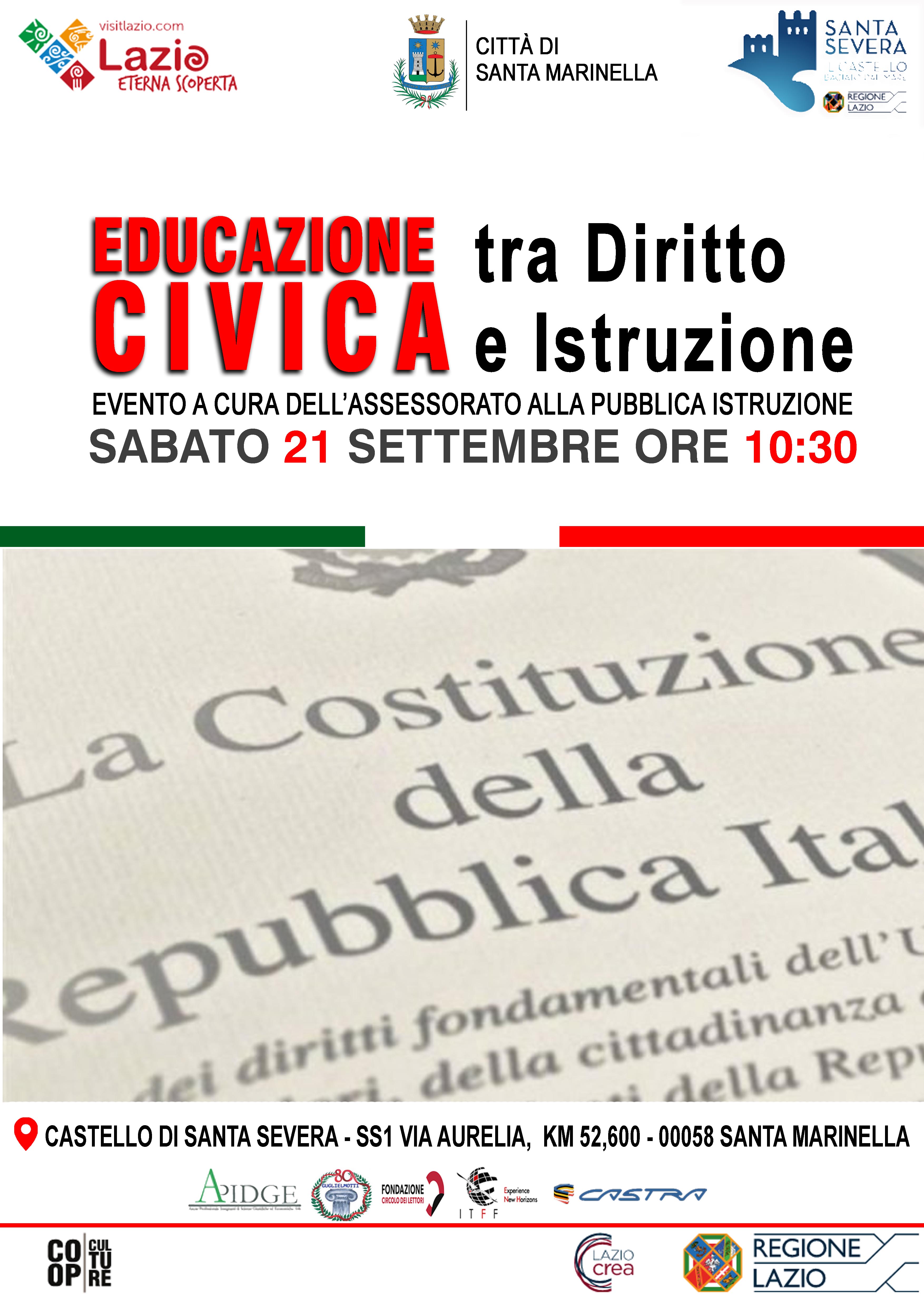 Sabato 21 settembre alle ore 10.30, nell’ambito dell’International Tour Film Festival, alla presenza di Pietro Tidei (Sindaco di Santa Marinella), Stefania Nardangeli (Assessore alla Pubblica Istruzione del Comune di Santa Marinella) Eleonora Mattia (Presidente Commissione Istruzione Regione Lazio) e di Maria Zeno (Dirigente scolastica Liceo “P.A.Guglielmotti di Civitavecchia) Apidge, l’Associazione degli insegnanti di Diritto, presieduta da Ezio Sina, organizza un evento sul ruolo della nuova Educazione Civica nel Sistema Istruzione in Italia.