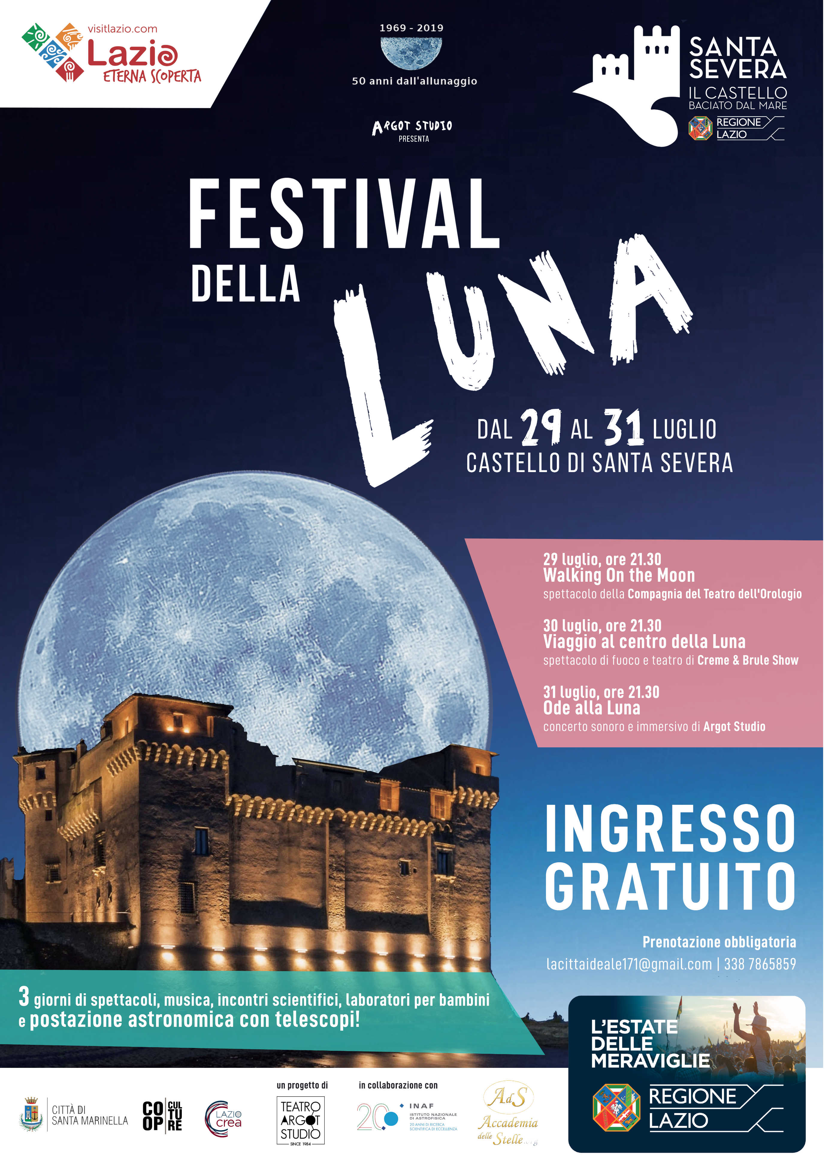In occasione del cinquantesimo anniversario dell’allunaggio Argot Studio organizza dal 29 al 31 luglio al Castello di Santa Severa il “Festival della Luna”, 3 giorni di spettacoli, musica, incontri scientifici, laboratori per bambini e postazione astronomica con telescopi!