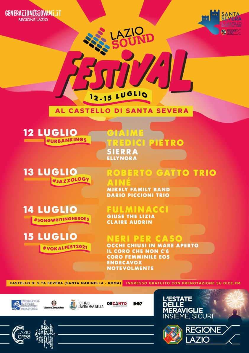 Fulminacci e Giuse The Lizia, Neri per Caso e Tredici Pietro, Giaime ed il duo rap Sierra, Roberto Gatto Imperfect Trio, Ainè e Occhi chiusi in mare aperto, Coro notevolmente, diretto da Marco Schunnach, Coro femminile EOS, diretto Fabrizio Barchi, Il coro che non c’è, diretto da Dodo Versino: questa la line-up del LAZIOSound Festival 2021, che mette a confronto e fa incontrare gli artisti simbolo di una generazione con le emergenti voci di LAZIOSound.