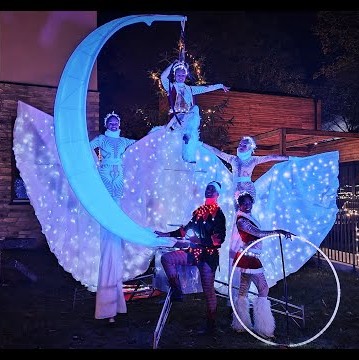 Spettacolo Light Christmas Show Spettacolo di varietà a cura di Sasselles Show: danze coreografiche e performance luminose con Angeli di Luce e un romantico Clown Bianco. Numeri di giocoleria luminosa, contorsionismo e acrobatica aerea su una grande installazione a forma di luna luminosa. Durata: 30 minuti per ciascuno show.