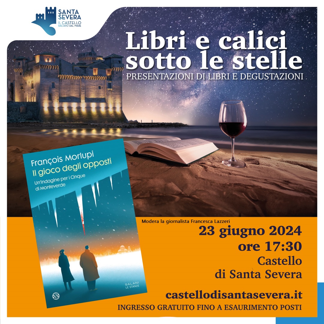 Proseguono gli appuntamenti della rassegna letteraria “ Libri e calici sotto le stelle” , domenica 23 giugno alle ore 17.30 con la presentazione del romanzo di François Morlupi,” Il gioco degli opposti.” Gli incontri sono promossi dalla Regione Lazio con la gestione della società in house LAZIOcrea d’intesa con Mic e Comune di Santa Marinella.