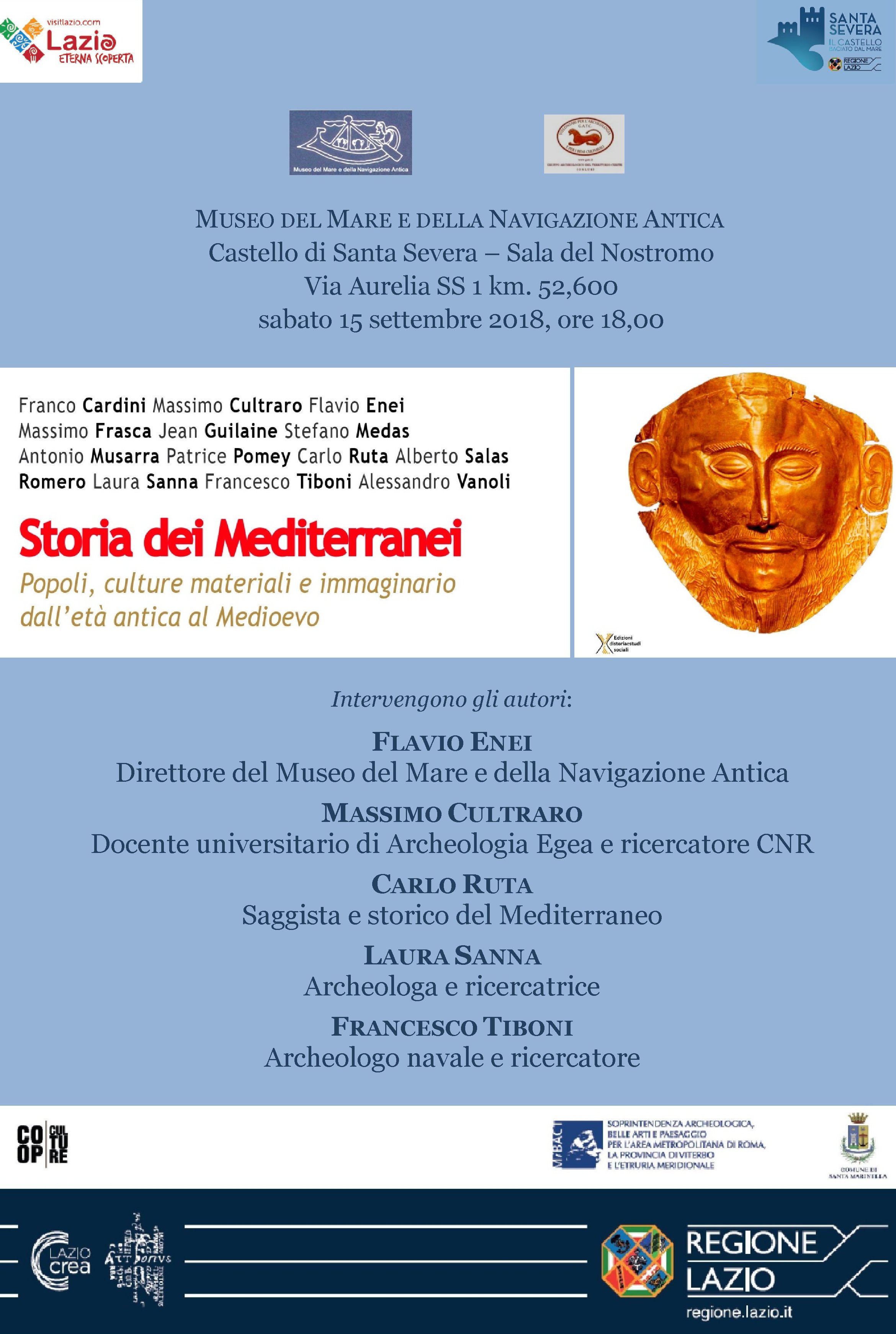 Sabato 15 settembre alle ore 18.00, nel piazzale delle Barrozze, presentazione del volume “Storia dei mediterranei. Popoli, culture materiali e immaginario dall’età antica al medioevo”. Il volume è stato pubblicato dalla casa editrice “Edizioni di Storia” e sarà in libreria dal mese di settembre. Si tratta di iniziativa del Museo Civico di Santa Marinella “Museo del Mare della Navigazione Antica” organizzata in collaborazione con la Regione Lazio, LAZIOcrea, Mibact, Comune di Santa Marinella e Coopculture.